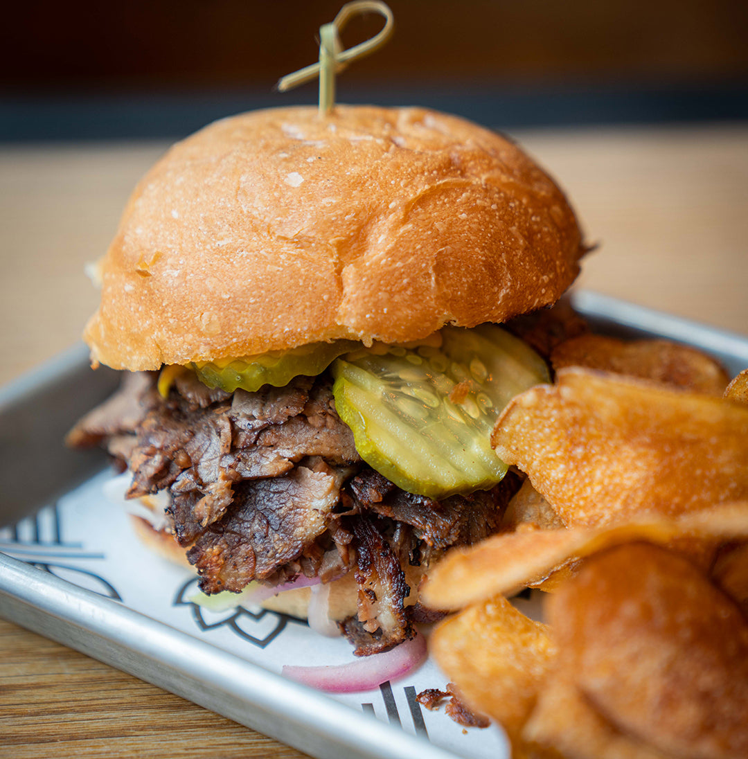 Roast Pork Sandwich - charred cabbage, alpine cheese, pickled red onion, truffle aioli on sesame foccia, chips - 18